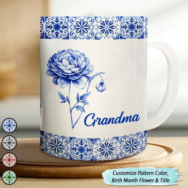 Mediterranean Pattern With Birth Month Flower – Personalized White Edge-to-Edge Mug